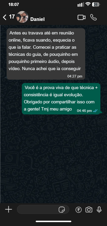 Não. O conteúdo é direto, leve e construído para qualquer pessoa que queira se expressar melhor. Não exige experiência — apenas vontade de evoluir.